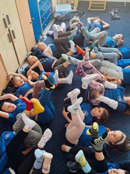 Nie zabrakło również działań twórczych – uczniowie projektowali „skarpetki życzliwości”, wyrażając w nich pozytywne emocje i wartości. Dużym zainteresowaniem cieszyły się także skarpetkowe zadania matematyczne, które połączyły naukę z dobrą zabawą.
