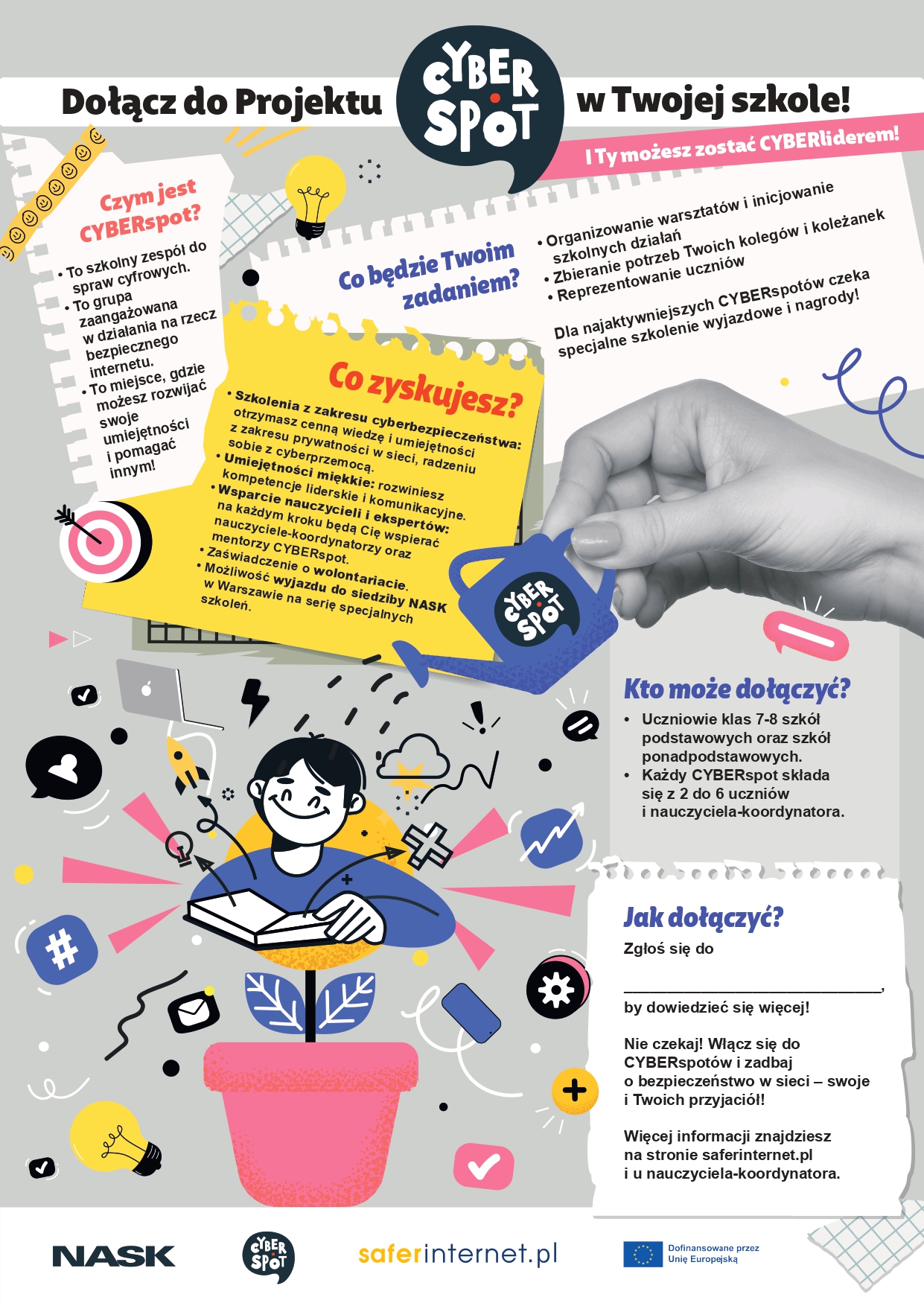 Projekt jest skierowany do uczniów klas 7-8 szkoły podstawowej oraz uczniów szkół ponadpodstawowych. Kluczowym elementem jest zaangażowanie nauczyciela-koordynatora, ale tę funkcję może także pełnić szkolny pedagog, psycholog lub inny członek kadry pedagogicznej. Koordynator będzie wspierał uczniów w działaniach, rekrutował ich do CYBERspotów i monitorował działalność zespołów. W zespole może się znaleźć od 2 do 6 uczniów.